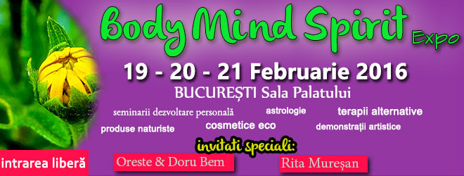 Daca ești interesat de tratamente alternative, de alimentația bio, de cure naturiste, de puterea de vindecare a plantelor, de efectele miraculoase ale meditației, de importanta regăsirii de sine și a lui Dumnezeu, daca ești frământat de întrebări privind sensul vieții sau daca pur și simplu simți că trebuie să schimbi ceva în viața ta pentru un echilibru mai bun în toate, atunci trebuie să vii la Body Mind Spirit Expo, în weekendul 19-21 Februarie, în București la Sala Palatului.