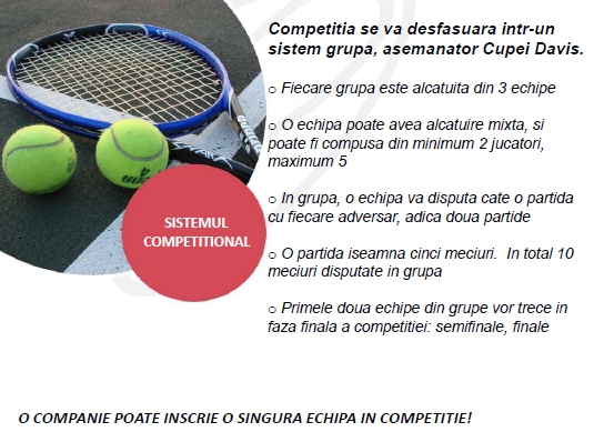 Federatia Romana de Sport Corporatist doreste sa va anunte ca au inceput inscrierile pentru Campionatul National Corporatist de Tenis de Camp. Competitia este dedicata exclusiv angajatilor din companii si se va desfasura in perioada martie – mai 2016, in Complexul Sportiv Tei.