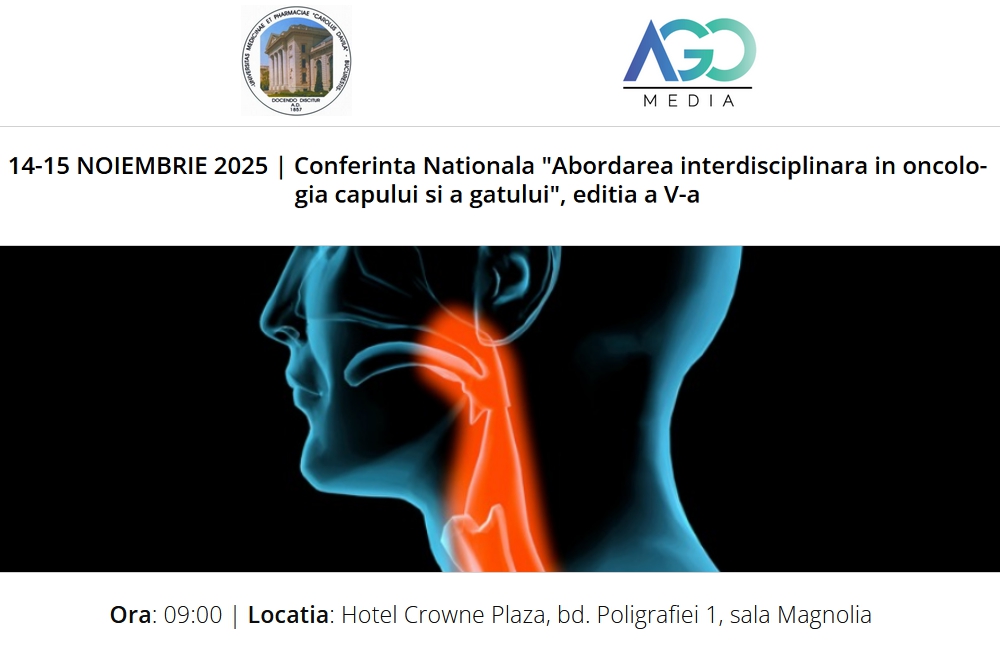 Afisari: 600AGOMedia va invita la a V-a editie a Conferintei Nationale "Abordarea interdisciplinara in oncologia capului si a gatului" ce va avea loc in perioada 14-15 noiembrie 2025 la Hotel Crowne Plaza, sala Magnolia.
