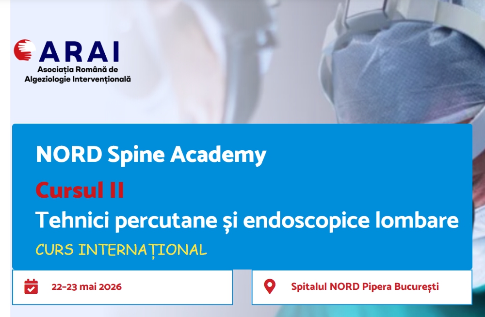 Vă invităm la cel de-al doilea curs hands-on organizat de ARAI sub umbrela NORD Spine Academy, cu titlul „Tehnici percutane și endoscopice lombare”! Acesta se va desfășura în 22 și 23 mai 2026, la Spitalul NORD Pipera, din București.
