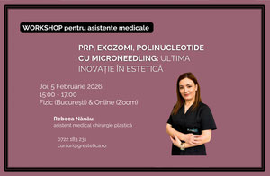 Workshop pentru asistente medicalePRP, Exozomi, Polinucleotide cu Microneedling: Ultima inovație în esteticăJoi, 5 Februarie 202615:00 – 17:00Fizic (București) & Online (Zoom)Trainer: Rebe...