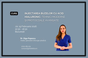 Curs: Injectarea buzelor cu acid hialuronic – Tehnici moderne și protocoale avansateData: 19 februarie 2026Ora: 10:30 – 16:30 (teorie, pauză de masă, practică hands-on)Locație: Bucur...