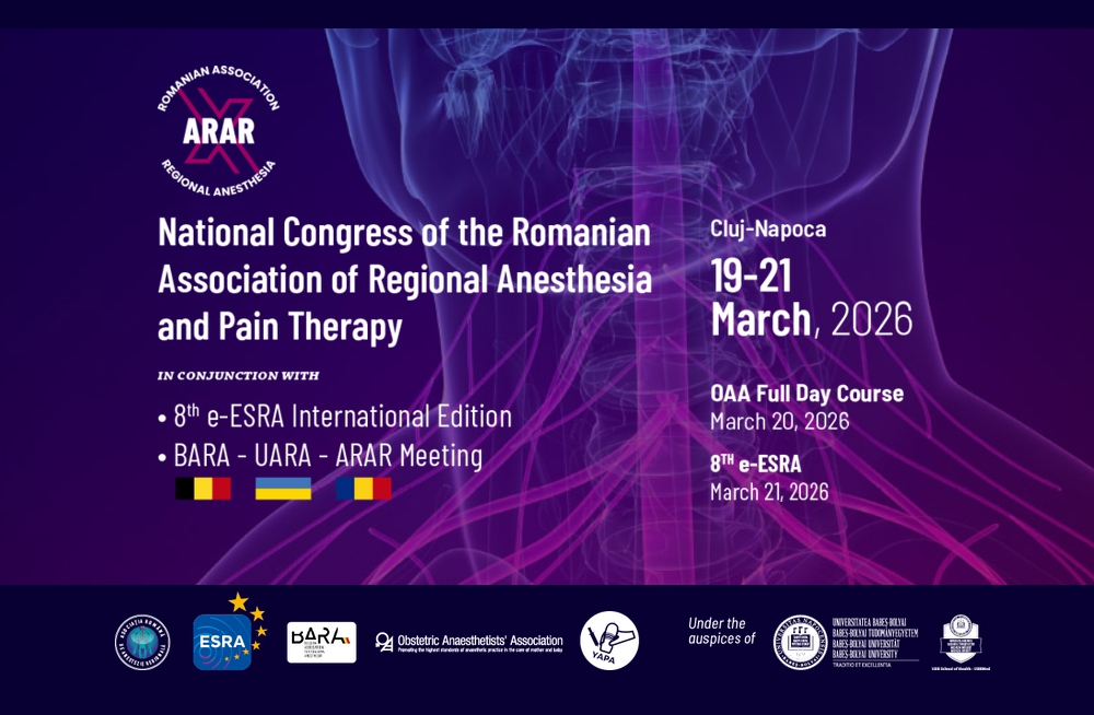 For ten years, the Romanian Association of Regional Anesthesia and Pain Therapy (ARAR) Congress has been a symbol of community, excellence, and applied learning. This anniversary edition is both a celebration of our journey and an opportunity to look ahead together. We are delighted to welcome you to Cluj-Napoca, from March 19–21, 2026, for this special occasion.